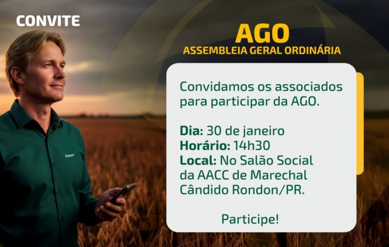 A Assembleia terá início às 14h30, no Salão Social da AACC, em Marechal Cândido Rondon, reunindo associados para apresentação de resultados, números da Cooperativa e o balanço do exercício 2025.