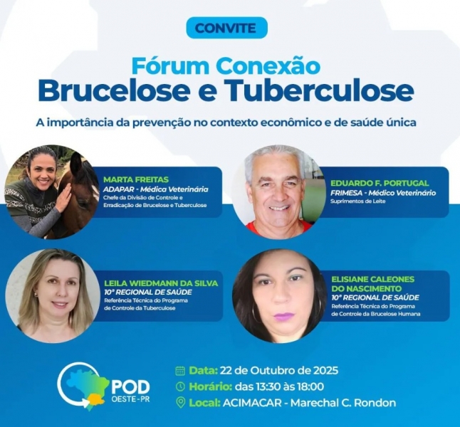 A Câmara Técnica de Sanidade Agropecuária, vinculada ao Programa Oeste em Desenvolvimento, promove nesta semana o Fórum Conexão: Brucelose e Tuberculose, com o objetivo de discutir os impactos dessas doenças no contexto econômico e na saúde única. O evento contará com palestras técnicas ministradas por especialistas que atuam diretamente no controle e erradicação da brucelose e da tuberculose, tanto em rebanhos animais quanto em humanos.