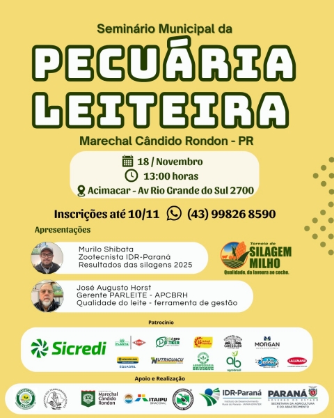 Trata-se do Seminário Municipal da Pecuária Leiteira, o qual terá por local o auditório da Acimacar, a partir das 13h00.