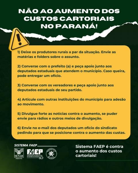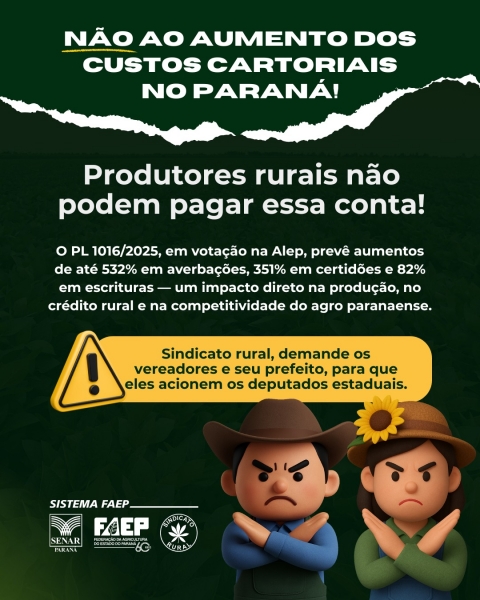 A campanha também destaca o papel dos sindicatos rurais como articuladores políticos e defensores dos interesses do campo. A mensagem é clara: o aumento das custas cartoriais ameaça a sustentabilidade do agro paranaense e exige resposta imediata da sociedade civil e dos representantes políticos.