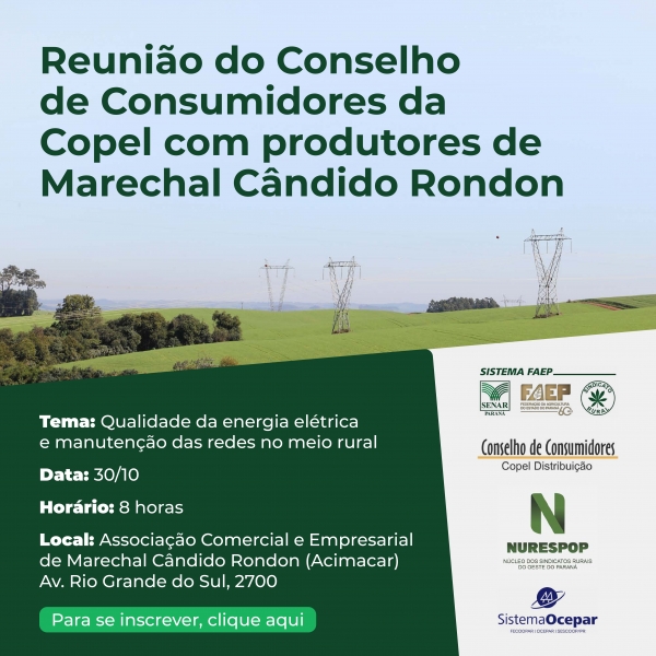 Av. Rio Grande do Sul, 2700Foi transferida para o dia 30 deste mês de outubro, a partir das 08h00, no auditório da Associação Comercial e Empresarial de Marechal Cândido Rondon, a audiência pública para debater os problemas inerentes ao fornecimento de energia rural na microrregião.