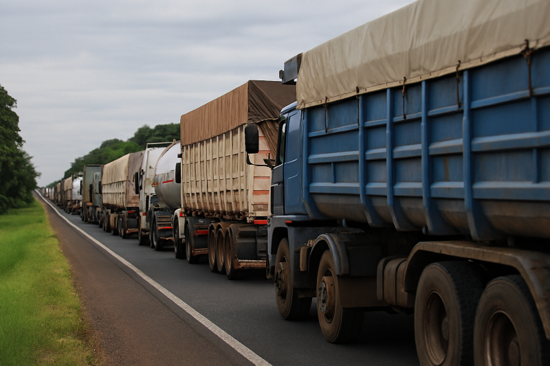 Além do grande número de caminhões que transitam na fronteira, os enormes congestionamentos também se devem às muitas pessoas que se deslocam para compras em Salto Del Guairá, no Paraguai.