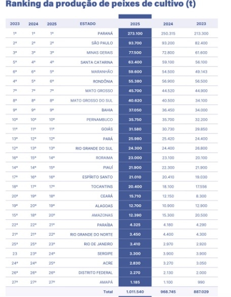 São Paulo aparece na segunda posição no ranking nacional de produção de peixes de cultivo, com 93.700 toneladas, volume 0,54% maior do que o de 2024. Minas Gerais (77.500 t) está logo atrás de São Paulo, seguido por Santa Catarina (63.400 t) e Maranhão (59.600 t), que ganhou uma posição e fecha a lista dos cinco primeiros do ranking.
